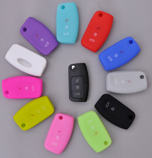 Auto Schlüssel Hülle Silikon Schutz Cover Fluoreszierend Blau kompatibel mit Ford Focus Fiesta Ecosport S-Max Kuga C-Max 3 Tasten Klappschlüssel