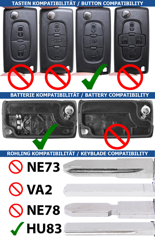 Autoschlüssel Funk Fernbedienung Austausch Gehäuse mit 4 Tasten + HU83 Rohling + Batterie kompatibel mit Citroen C8