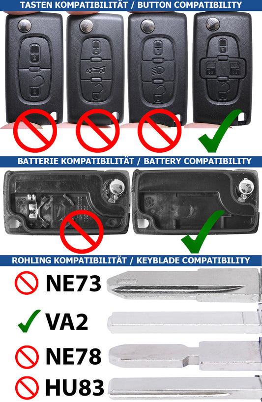 Autoschlüssel Funk Fernbedienung Austausch Gehäuse mit 4 Tasten + VA2 Rohling + Batterie kompatibel mit Peugeot 807 1007
